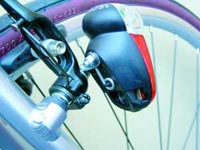 Here you can see the hot setup back in 1999. On our tandem, using a standard Lumotec, I use a Schmidt cantilever style fork crown mount. The headlight is high enough above the tire that the beam isn't blocked by the tire. There's a handlebar bag above the light. I'm tall enough (5'10") that the handlebar is high enough to hold the bag high enough to clear the light. If you ride with a lower handlebar, you might not have space for a headlight there. How Not to Do It! Don't mount the lights upside down. Many dynamo headlights and taillights can get water inside if they're upside down, and most of the headlights are designed to project brighter light at the top of the focused beam, to give more even and safer road illumination. The top part of the beam is projected further down the road, therefore it needs to be brighter. Our headlights tend to be more expensive than many other headlights designed for use with dynamos. The higher prices are partly due to the superior design of the optics. If you mount the lights upside down, you'll end up with a headlight that doesn't even work as well as the cheapest headlights available, you've wasted your money, and you're less safe while riding because you can't see the road ahead of you as well. Please don't mount the lights upside down! One custom builder (who won't be named) thought it would be perfect to place a Supernova E3 headlight upside down under the front of a basket with a fender on the bike that was too short to keep water spraying onto the light. But the Supernova headlights are designed to be used with the mount positioned at the bottom of the headlight housing, even if you have the round or symmetrical beam (which by the way they no longer make). The wires connect at the bottom, and water can enter the housing where the wires are attached if you position the light upside down. With the light right side up, it's never a problem. But when mounted upside down, not only can rain fall directly onto the headlight, but water gets picked up by the tire and is thrown forward, directly onto the headlight. Don't mount dynamo headlights or taillights upside down! You may think that having the light upside down makes for an interesting installation. You may think that it helps get the light out of the way; some place more convenient. Well, maybe it does, but it doesn't matter! When the light stops working, that's not particularly convenient, though it may be interesting on a fast descent. What does "right side up" mean, Peter? It usually means that the part of the light that attaches to the mount is located at the bottom of the light. If the part of the light that attaches to the mount is at the top, then, the light itself is upside down. There is one dynamo headlight designed specifically for upside down mounting. It's a special version of the Schmidt Edelux. We have them in stock. There is also the Busch & Müller IQ-X, which has a mounting point that can be either at the bottom or at the top. What's compatible with what? Don't assume that because a headlight comes with a mount, that that mount will work well on your bike. Here's an example of a very good mount, and a very nice bike, where the two are not a good mix. The 2009 Busch & Müller Lumotec CYO headlights came with a very strong steel mount. It's made of 4.5mm diameter rod. If you've got a vise and can apply some leverage you can bend it if necessary to get a better fit for your needs.